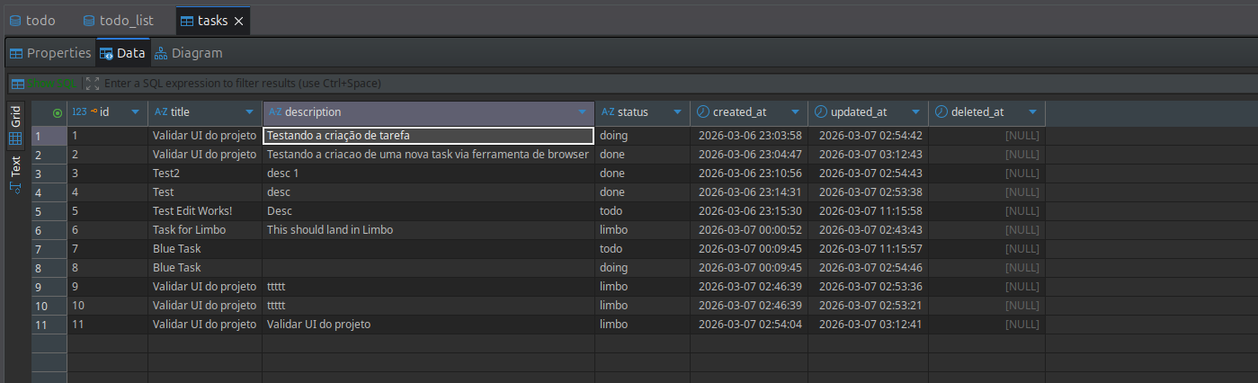 Exclusões Seguras (Soft Deletes): Para prevenir perda catastrófica de dados, deletar uma tarefa no quadro visual não a apaga permanentemente do banco de dados na hora, garantindo tranquilidade institucional e logs históricos de auditoria no "fundo" do sistema se necessário.