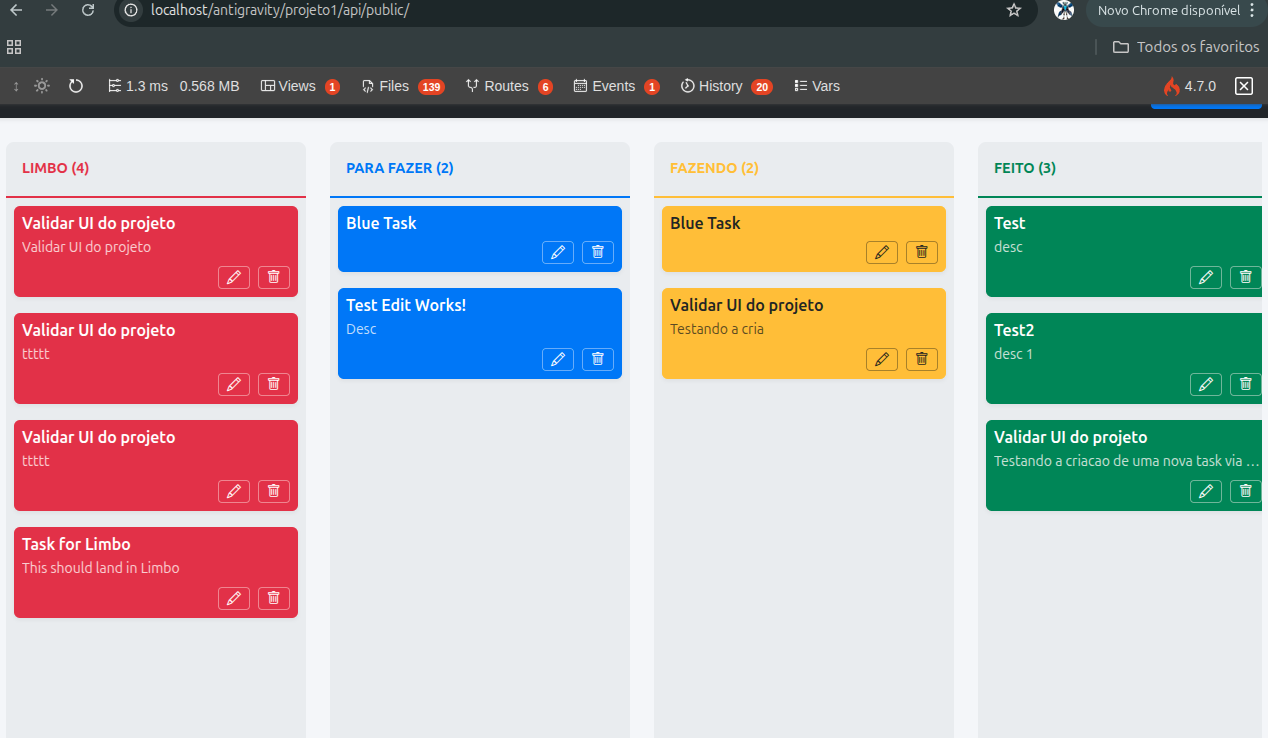 Feedback de Interface Refinado: Alertas e balões na tela não são daquele modelo nativo e "feio" dos navegadores. Usamos o sistema SweetAlert2 que oferece janelas redondas, animadas e agradáveis. Além disso, cada cartão se coloriza com a cor da coluna correspondente (Cartões Vermelhos, Azuis, Amarelos e Verdes).